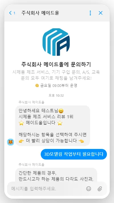 3D 모델링 작업에 대한 기본 안내사항을 전달받고, 상담원에게 메세지를 남겨줍니다.