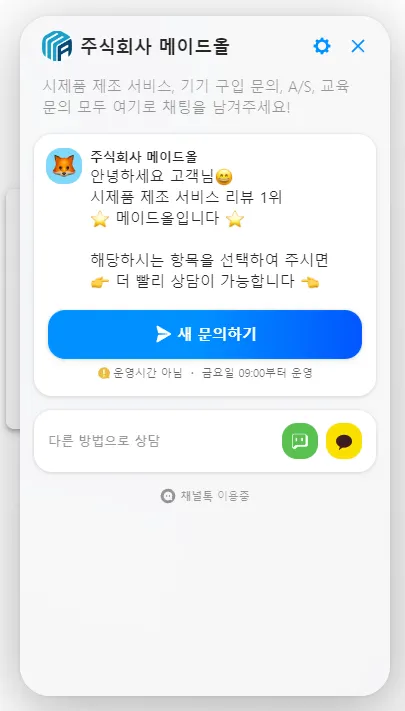 우측 하단에 생긴 채널톡 채팅방에서, 새 문의하기를 눌러 상담을 시작합니다.